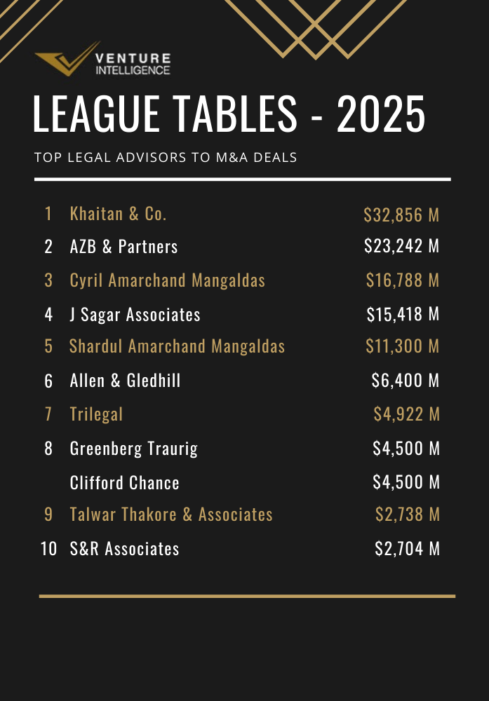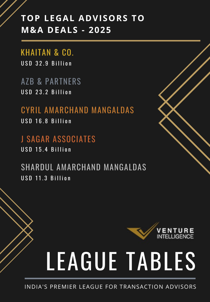 Khaitan & Co. topped the Venture Intelligence League Table for Legal Advisor to M&A Transactions by value during 2025 advising 84 deals worth $32.9 Billion. It was followed by AZB & Partners ($23.2 Billion across 50 deals) and Cyril Amarchand Mangaldas (CAM) ($16.8 Billion across 85 deals). J Sagar Associates ($15.4 Billion across 40 deals) along with Shardul Amarchand Mangaldas ($11.3 Billion across 41 deals) completed the top five.