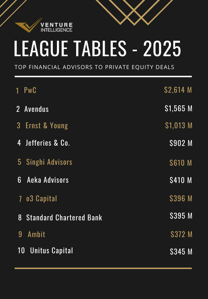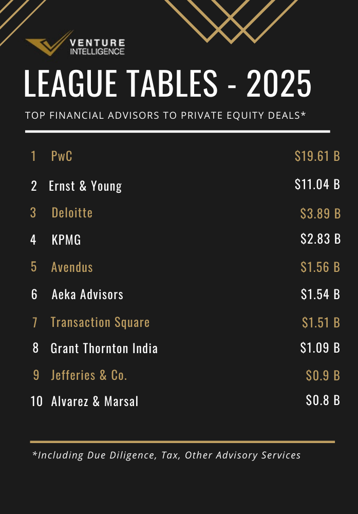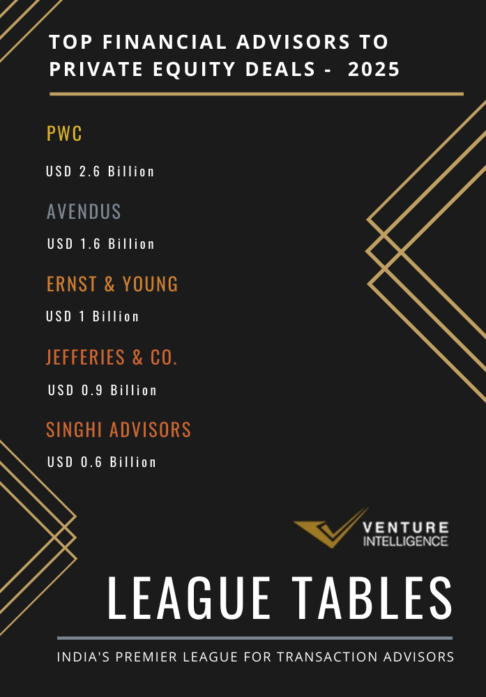 The Venture Intelligence League Tables, the first such initiative exclusively tracking transactions involving India-based companies, are based on the value of PE and M&A transactions advised by Financial and Legal Advisory firms.